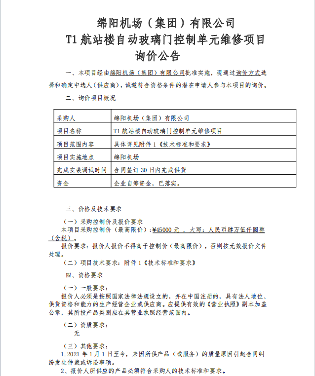 綿陽(yáng)機(jī)場(chǎng)(集團(tuán))有限公司 T1航站樓自動(dòng)玻璃門控制單元維修項(xiàng)目詢價(jià)公告